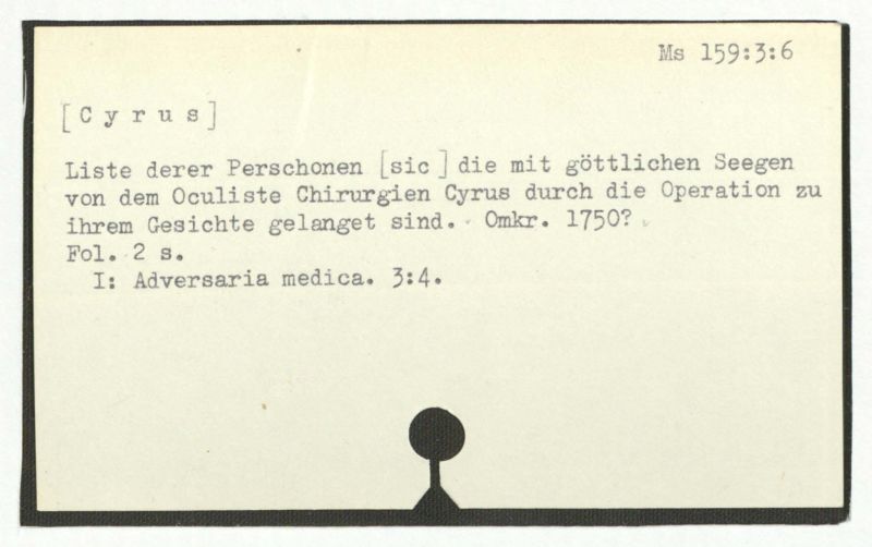 Liste der Perschonen [sic] die mit göttlichen Seegen von dem Oculiste Chirurgien Cyrus durch die Operation zu ihrem Gesichte gelanget sind. Omkr. 1750? Fol. 2 s.