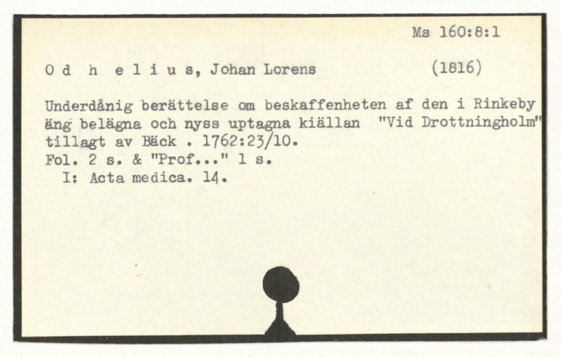 Underåning berättelse om beskaffenheten af den i Rinkeby äng belägna och nyss uptagna kiällan "Vid Drottningholm" tillagt av Bäck . 1762:23/10.